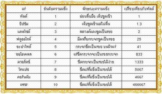 คุณคงคิดในใจว่าบอกมาพูดถึงเรื่องนี้กันทำไม แต่สิ่งเหล่านี้ก็จะช่วยให้คุณตัดสินใจในการเลือกซื้ออัญมณีให้เหมาะกับบุคลิกของคุณได้ ในตารางความแข็ง เพชร นอกจากจะมีความแข็งมากที่สุดแล้วยังมีความแข็งที่แตกต่างจากอันดับรองลงไป คือ แร่คอรันดัม ถึง 140 เท่าเพชรจึงทำให้เพชรเป็นรอยได้เท่านั้น