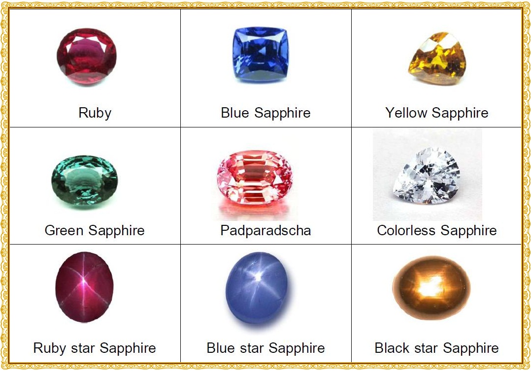 อัญมณีในกลุ่มคอรันดัม ได้แก่ ทับทิม ไพลิน บุษราคัม และเขียวส่อง ชื่อพลอยเหล่านี้ล้วนแล้วแต่เป็นที่คุ้นหูของผู้ที่ซื้อขายพลอย ทั้งหมดนี้เป็นพลอยเนื้อแข็ง โดยปกติจะใส ไม่มีสีหรือเรียกว่า Colorless Sapphire คอรันดัมสีแดงที่เราเรียกว่าทับทิมคือ Rubyสีชมพูอมส้ม หรือส้มอมชมพูเรียกว่า Padparadscha ส่วนคอรันดัมสีอื่นๆเราจะเรียกชื่อสีนำหน้าแล้วตามด้วยคำว่า Sapphire เช่น Blue Sapphire (ไพลิน)Yellow Sapphire (บุษราคัม) Green Sapphire(เขียวส่อง) นอกจากนี้ยังมี พลอยที่มีปรากฏการณ์สตาร์ได้แก่ Rubystar Sapphire, Blue star Sapphire และ Black star Sapphire ซึ่งจะแสดงลักษณะของดาวหกแฉกอยู่บนผิวของคอรันดัมที่เจียระไนแบบหลังเบี้ย