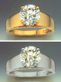 จะเห็นได้ว่าการดูสีเพชรได้นั้น ก็ต้องเป็นเพชรที่ยังไม่ขึ้นเรือน เพราะความแตกต่างของน้ำ 1-2 ระดับถ้ามองจากด้านหน้าก็แทบจะแยกกันไม่ออก ยิ่งเพชรเม็ดนั้นอยู่บนตัวเรือนทองด้วยแล้วก็จะทำให้สังเกตุเห็นสีเพชรได้ยากยิ่งขึ้น เช่นในรูปด้านล่าง ในตัวเรือนทองและทองขาวใช้เพชรสี J เราจะเห็นสีของเพชรได้ชัดในตัวเรือนทองขาวมากกว่าตัวเรือนทอง