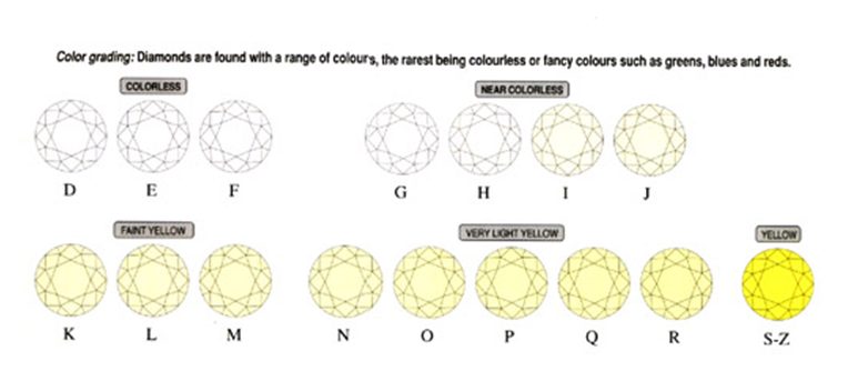 การจำแนกสีของเพชรจะแยกเฉพาะโทนสีขาว และเหลืองเท่านั้น สามารถเรียงจาก D ไปถึง Z ซึ่งหากแทนด้วยอักษร D จะหมายถึง มีความขาวใสมากที่สุด ซึ่งคนไทยจะเรียกว่า “น้ำ” เพชรน้ำยิ่งสูงก็จะยิ่งขาวและ ไม่มีสีเหลืองเจือปน เพชรระดับไร้สี (Colorless) ได้แก่ เพชรน้ำ 100, 99, 98 หรือเพชรสี D, E, F ส่วนเพชรระดับเกือบไร้สี (Near Colorless) ได้แก่เพชรน้ำ 97, 96, 95, 94 หรือ G, H, I, J
